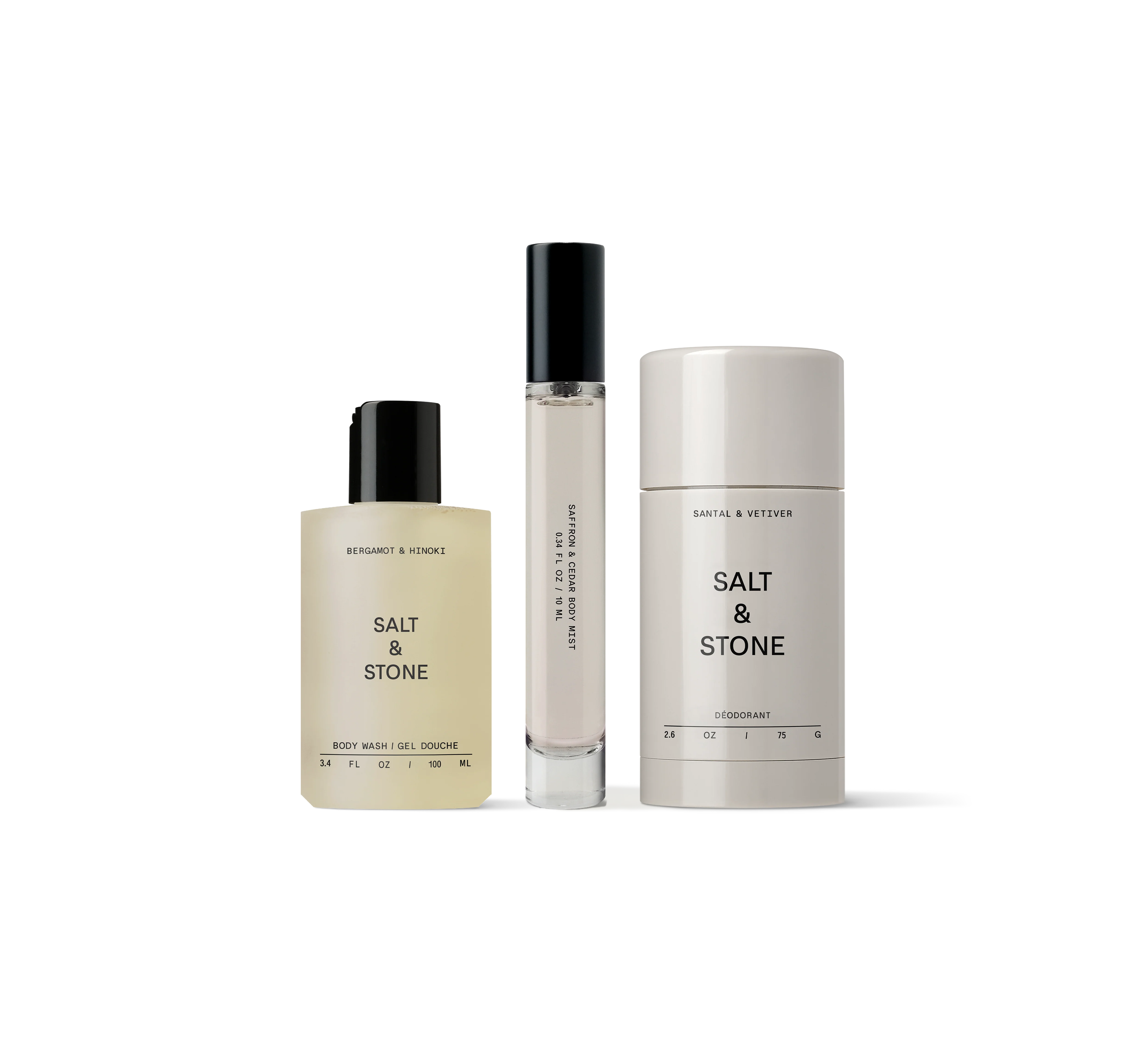 Discover three award-winning essentials in their most-loved scents—a full-sized Santal Deodorant, mini Saffron Body Mist and mini Bergamot Body Wash.